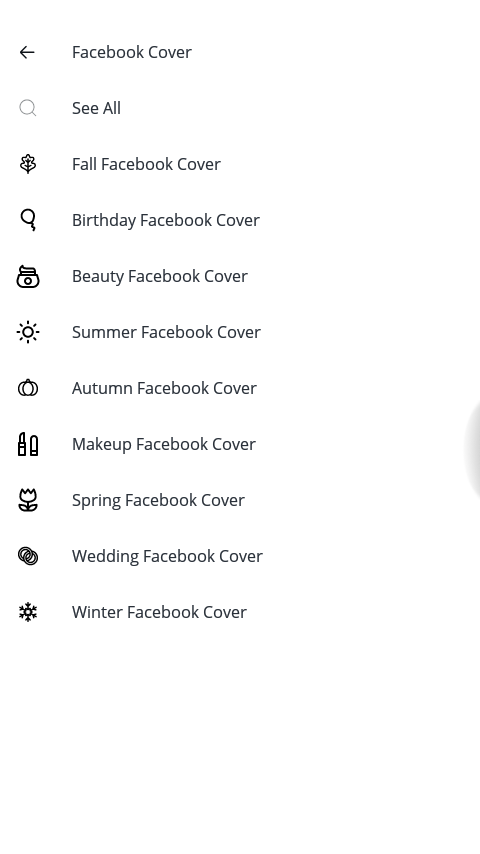 3. Pada gambar diatas, silahkan pilih facebook cover (sampul facebook), maka akan tampil halaman pilihan kategori cover, untuk memilih tipe-tipe template, untuk melihat semua tipe template silahkan pilih "See All"seperti berikut.
